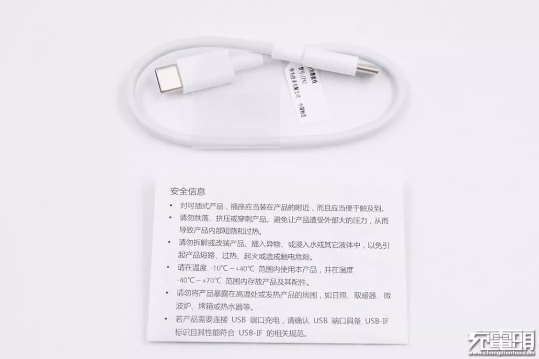 产品全家福:华为USB-C to USB-C 5A数据线以及安全信息说明书纸质文件。