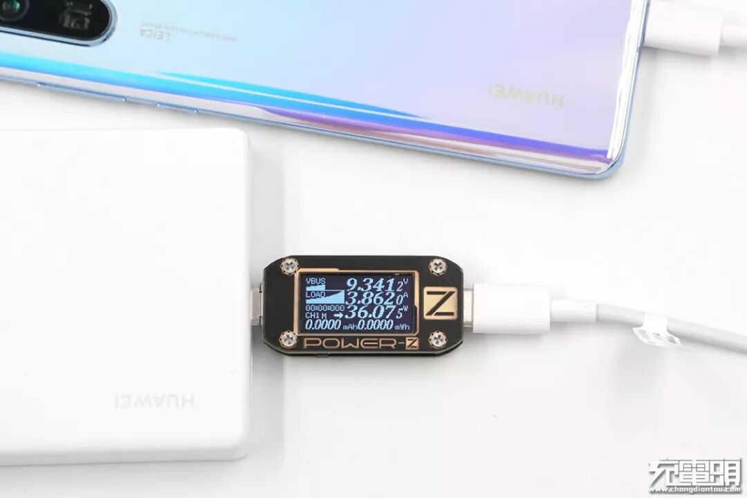 使用华为40W SCP移动电源的USB-C口给华为P30 Pro充电,数据线采用的是华为USB-C to USB-C 5A数据线,当前电压9.34V,电流3.86A,功率36.07W,手机顺利开启40W SCP快充充电模式。