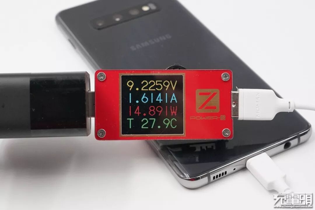充三星S10+,电压9.22V,电流1.61A,功率14.89W,开启AFC快充。