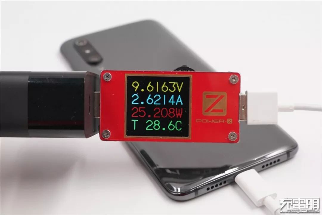 充小米9,电压9.61V,电流2.62A,功率25.20W,开启Charge Turbo快充。
