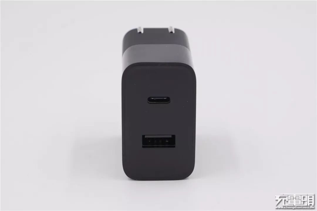 充电器输出面板微微向内凹,输出接口有两个,分别为USB-C与USB-A。