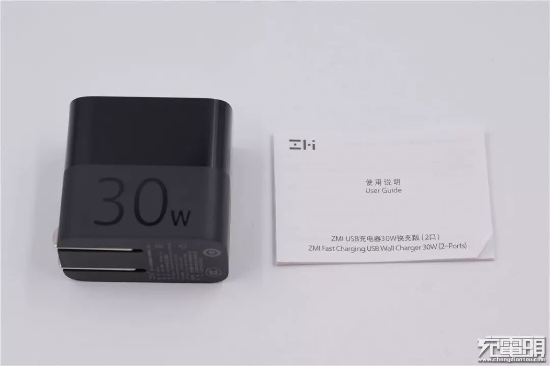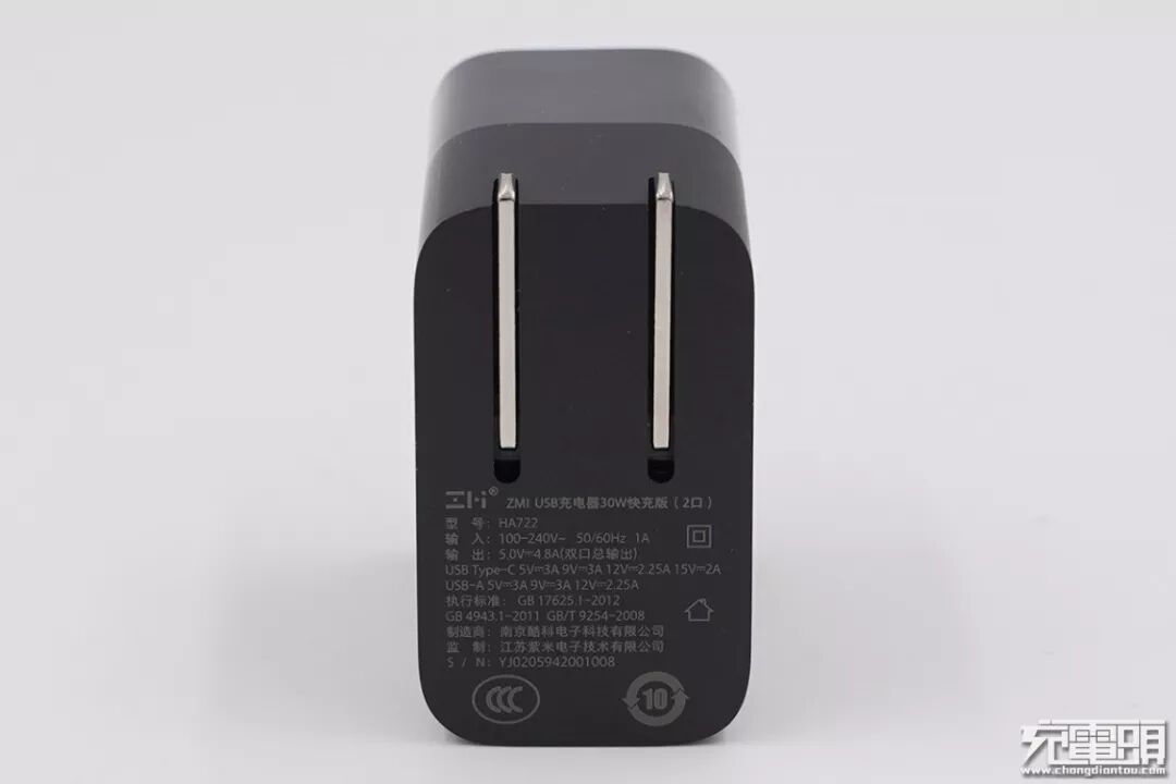 紫米最近喜欢直接在机身上印制主要性能参数,新出的几款产品都有类似的设计。这款充电器正面印着“30W”字样,很直观的就能了解到这款充电器的功率大小。