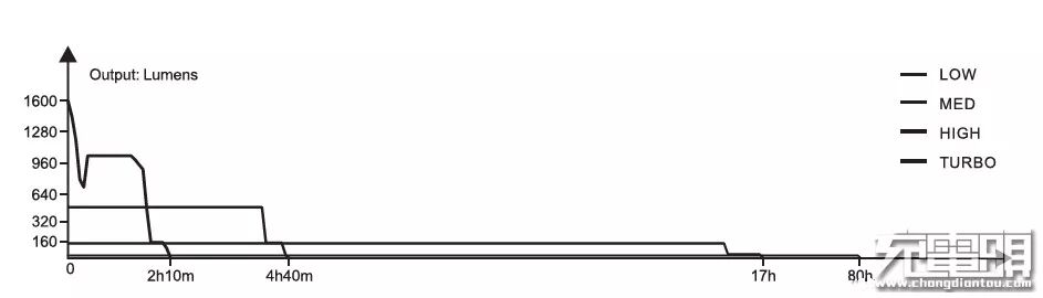 看一下官方的曲线图,TK22 V2.0在最高亮度1600流明续航时间为2小时10分钟(降档后手动累计点亮时长)。启动极亮档3分钟头部温度36.7,10分钟后温度控制在48.7度,中间最高记录温度为49.9度,散热还不错筒身大概在43度,手触感还还能接受,比暴力小直的温度还是低多了,毕竟手电的大脑袋散热快。