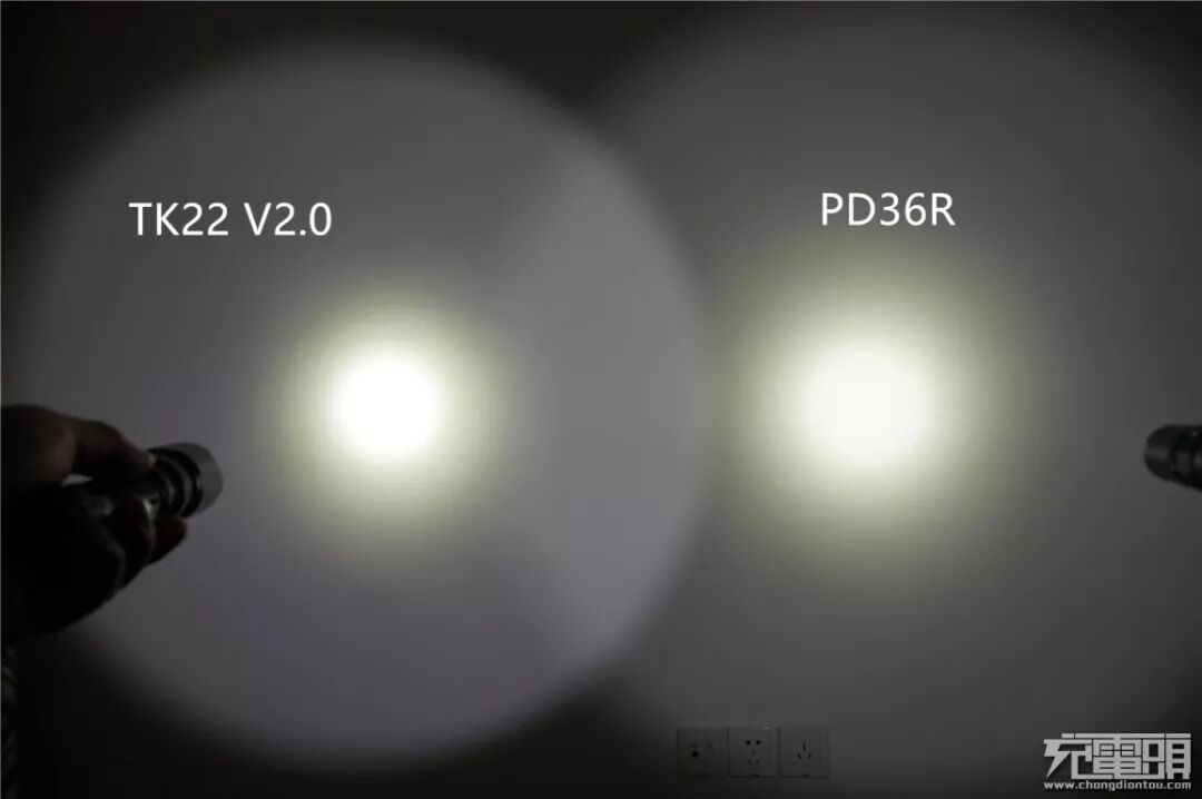 近距离地面光斑效果,两款的特点非常明显,PD36R更适合中近程使用,而TK22 V2.0完成 PD36R照射不到的地方,也就是说TK22 V2.0的适用范围可以带你飞的更高。