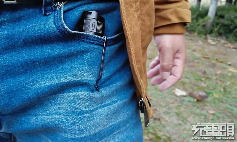 搭配的可拆卸报夹宽度达到8mm,用手试了一下报夹的弹性非常足,应付日常使用还是小菜一碟,虽说中筒手电的重量并不轻,报夹是个好东西,徒步登山悬挂会方便很多。40筒夹在裤兜里行走,也是能轻松应付的,从便携性上讲,除了手电头部略对腿部有点压迫别的还好。