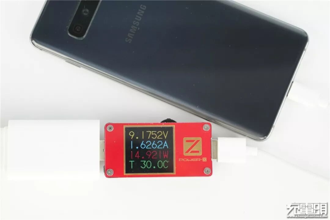 充三星S10+,电压9.17V,电流1.62A,功率14.92W,开启QC快充。