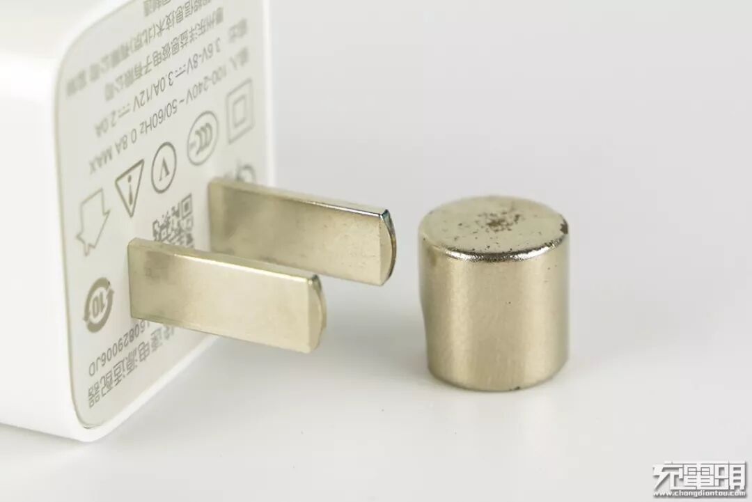 输出端面对立面是充电器的插脚端,灰色哑光材质,插脚为国标,采用不可折叠设计,同时该端面印制产品参数。