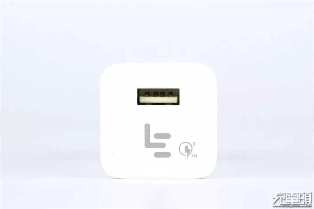 输出端面为白色哑光材质,USB-A输出接口,接口下方印制了2016年版乐视Logo,右旁一侧则是Qualcomm Quick Charge 3.0 LOGO,意味着这款充电器通过了高通QC3.0认证,在兼容性方面会更好。