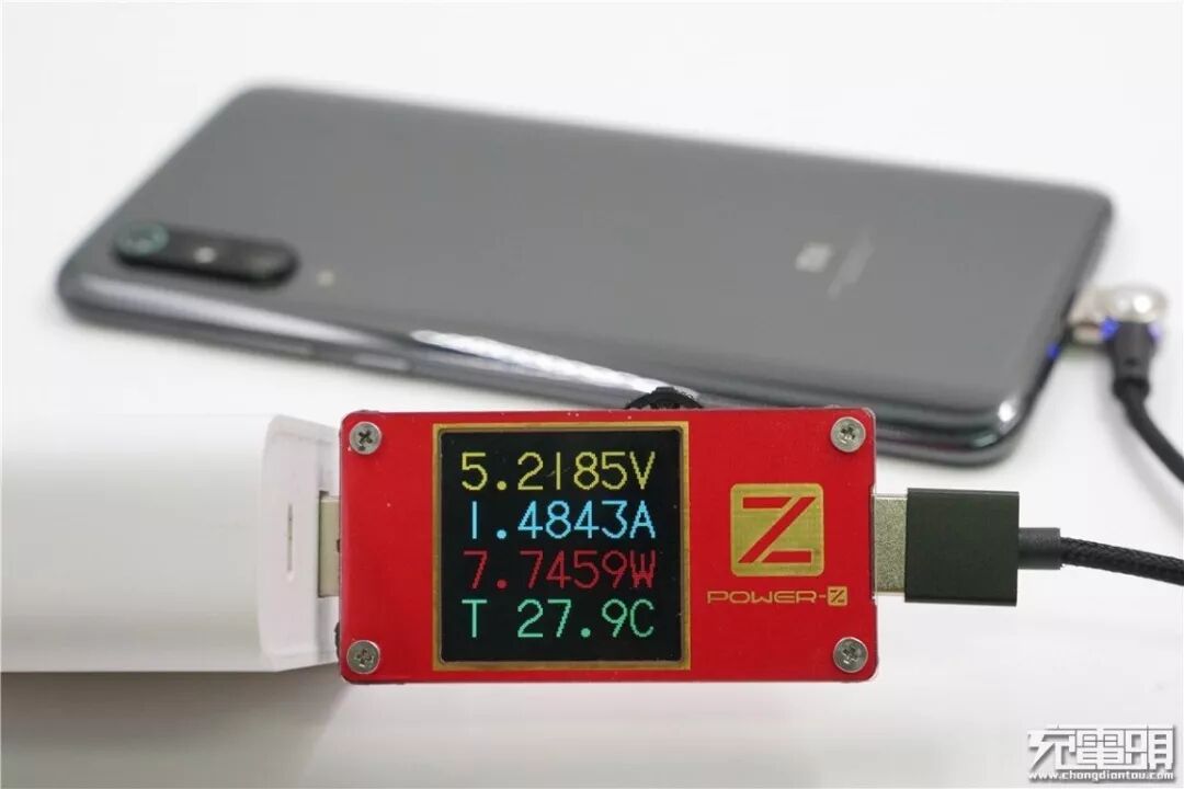 使用支持QC协议的充电器+Linkpo磁吸充电线为小米9充电,电压5.21V,电流1.48A,功率7.74W,普通充电模式,LinkPo磁吸充电线不具备数据通讯功能。