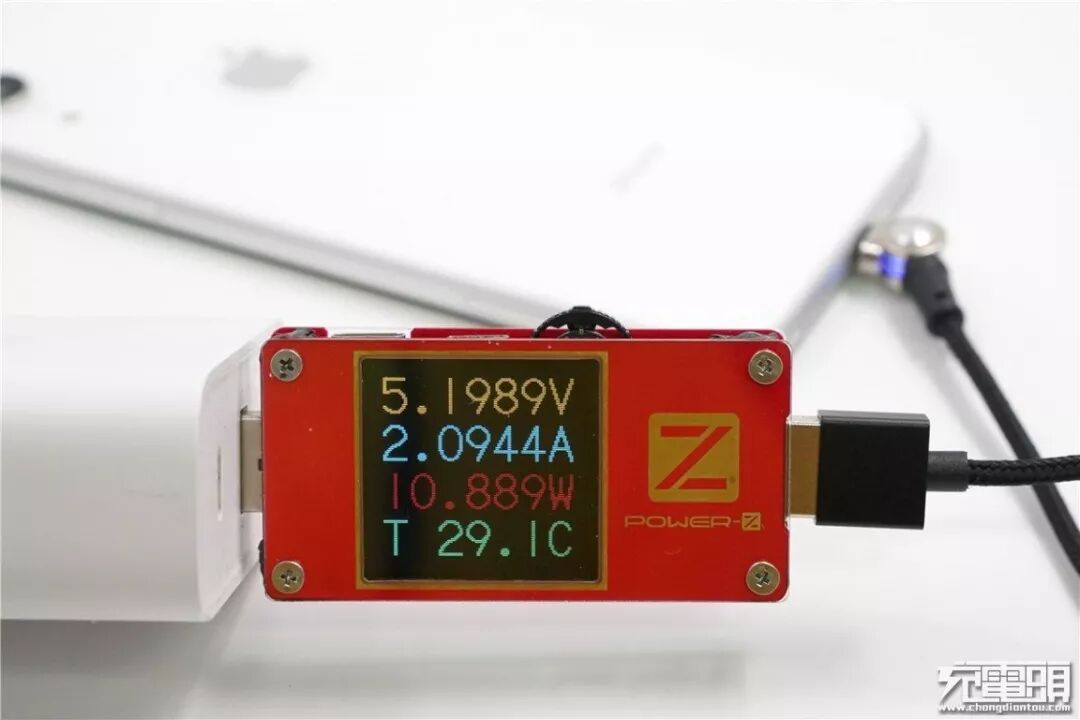 使用支持Apple 2.4A协议的充电器+Linkpo磁吸充电线为iPhone XR充电,电压5.19V,电流2.09A,功率10.88W,5V/2.1A协议充电。