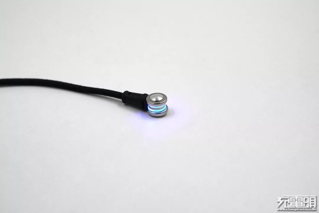 磁吸端还配有环形灯道,通电后发出蓝色光源,十分炫酷。