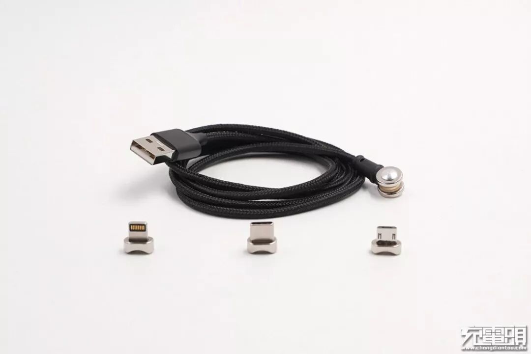 拆开包装,内有充电线+三枚磁吸接口,磁吸接口分别是Lightning、USB-C、Micro USB,涵盖了市面上几乎所有手机产品接口。