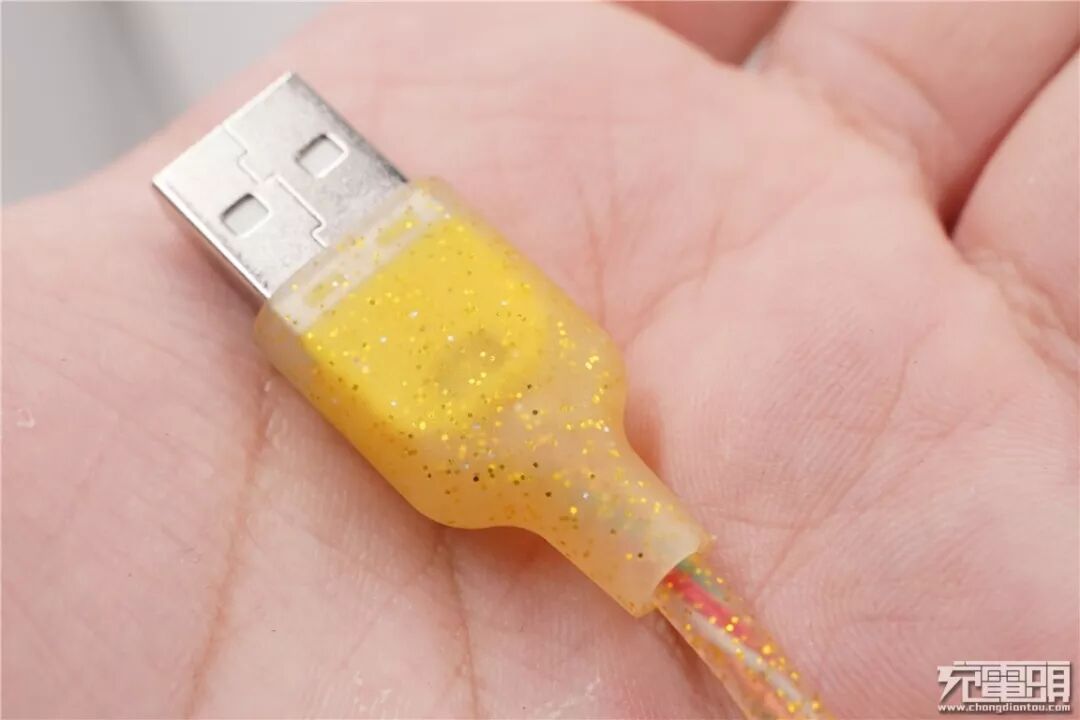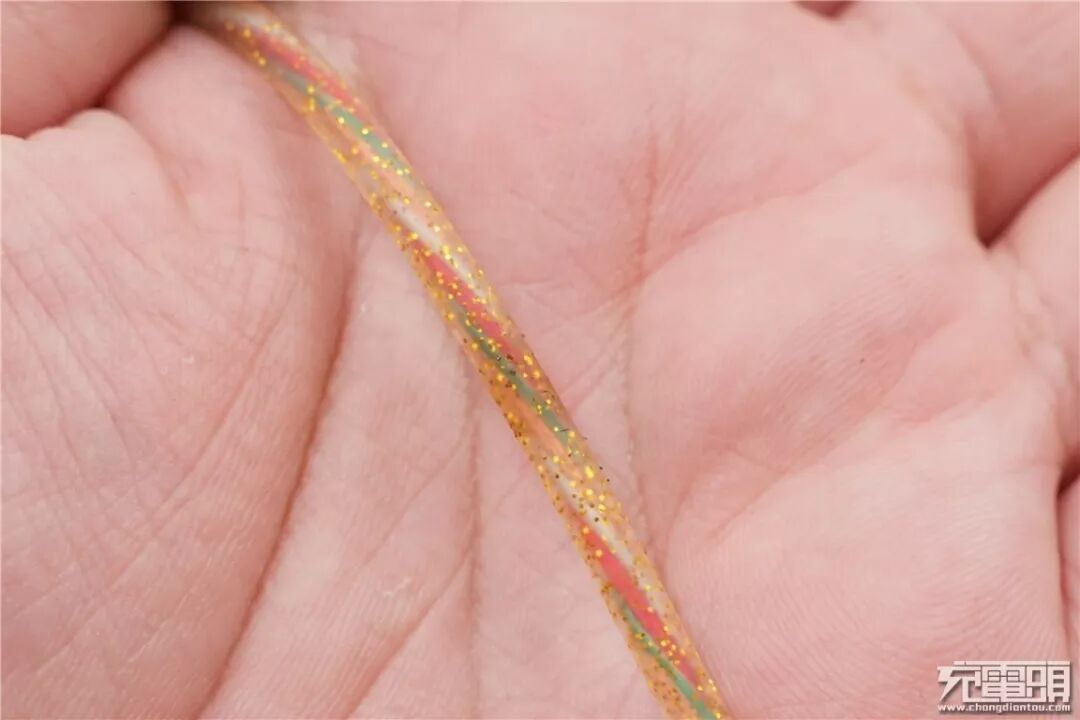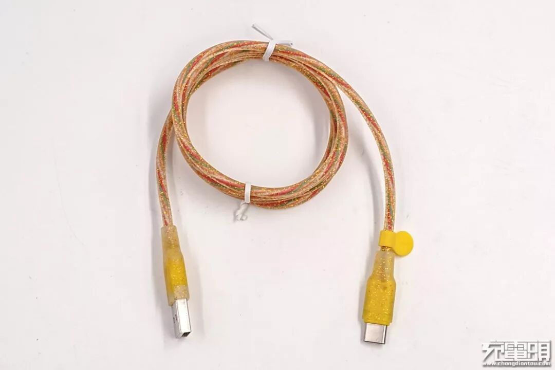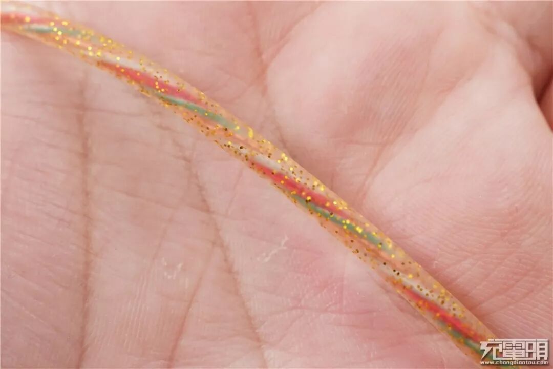 数据线线身特写。线身使用透明硅胶材质,看到内部的金色亮片,光照下非常的漂亮。从外部能很明显的看到线芯,内部线芯螺旋排版,有红、绿、白、橙四根。