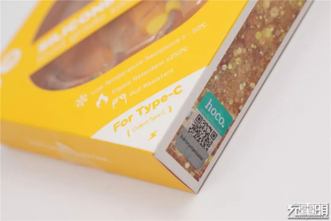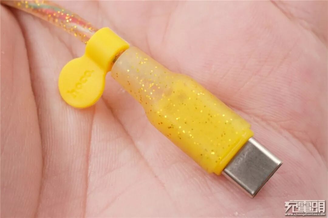 USB-C接头特写。数据线采用硬质塑料的接头,黄色透明,内部一样有金色的亮片。端头上还有一个软胶材质的小挂牌,牌子上印有hoco.的logo。硬质端头不易开裂,由于线体极软也能保证弯曲的角度。
