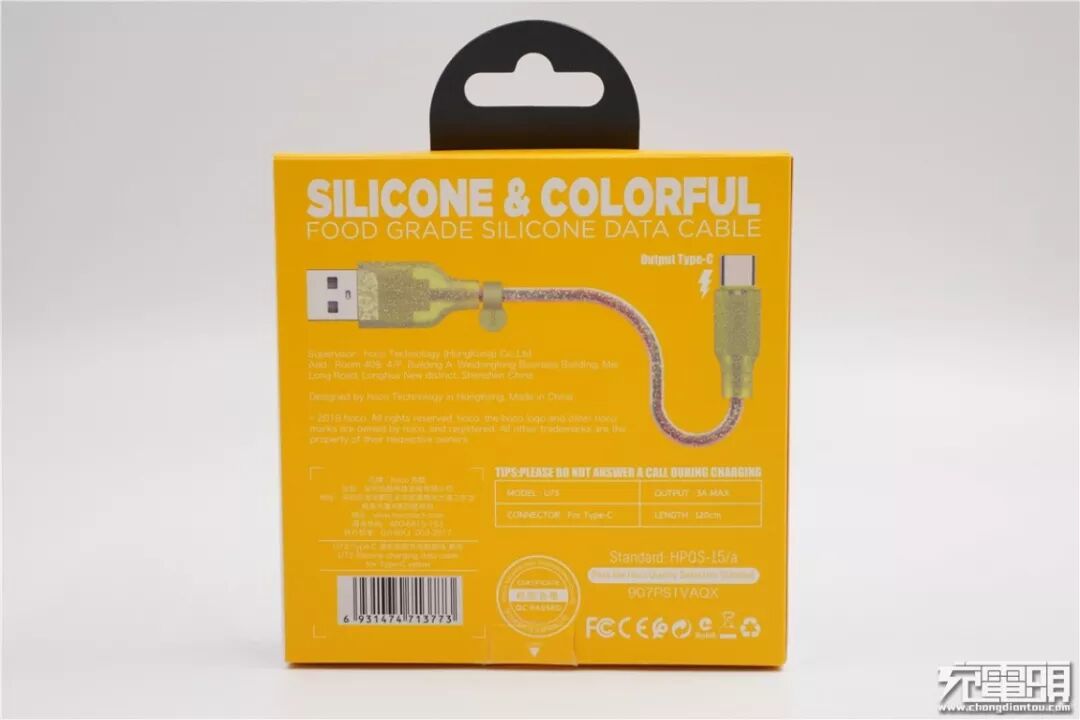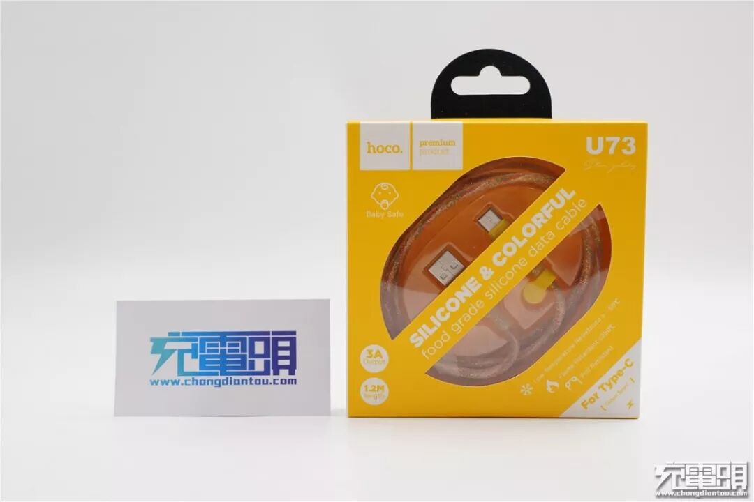 以非常炫酷的透明U73为例进行详细评测,这款数据线的外包装与内部数据线颜色一致,包装中央写着彩色硅、食用级硅胶数据线,外包装有个视窗可以看到内部的数据线。