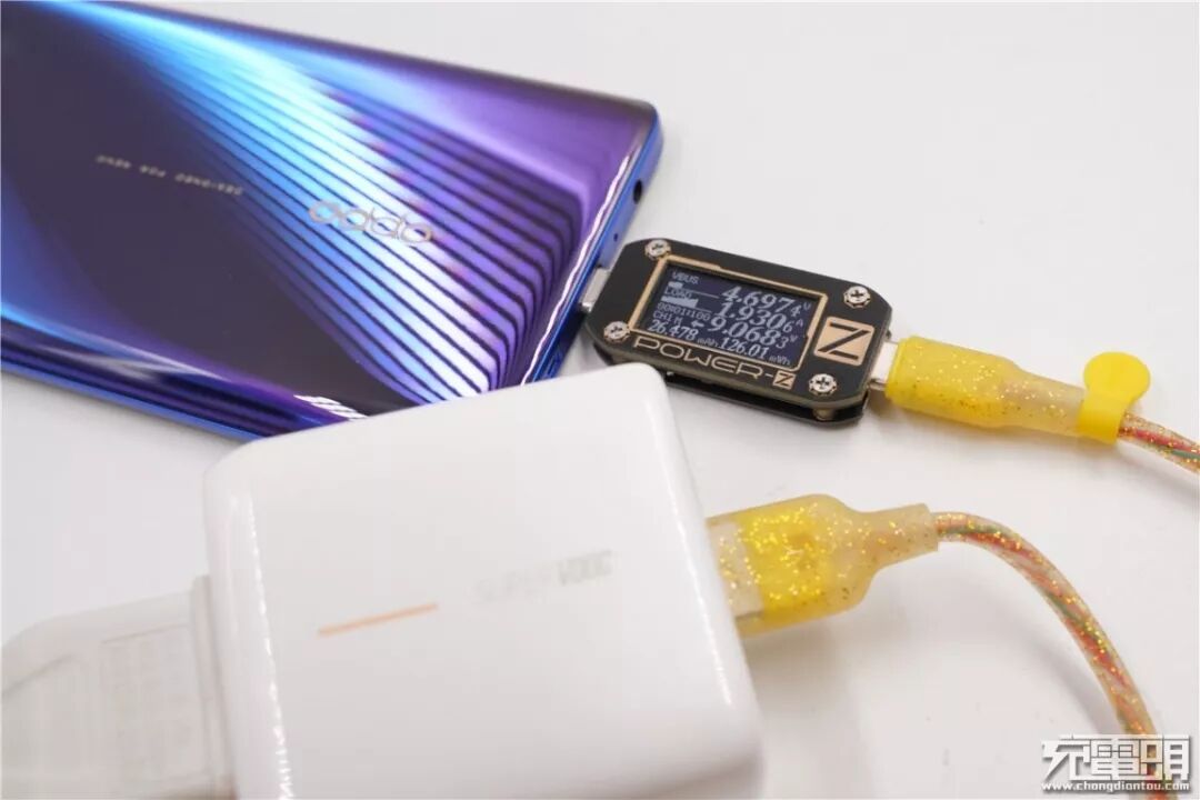 搭配OPPO原装SuperVOOC2.0充电器为OPPO Reno Ace充电,电压4.69V,电流1.93A,功率9.06W,无法开启SuperVOOC快充。