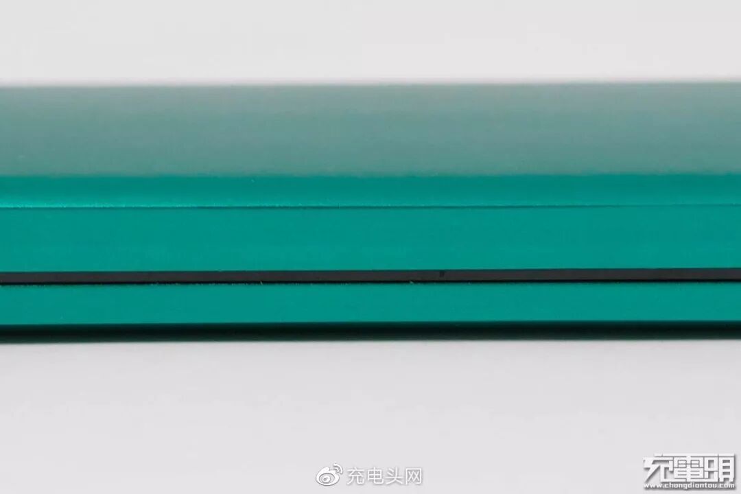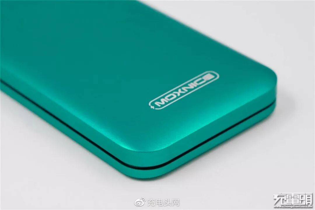 MOXNICE 10000mAh 18W PD移动电源有黑、红、粉、蓝、绿5种颜色款式,以绿色款为例向大家介绍。MOXNICE移动电源使用了阳极氧化铝制外壳,表面喷砂细腻,轻微的磨砂手感,没有那种粗糙的的感觉,无论观感还是手感都极其出色。另外金属外壳对于内部导热、散热也有着更好的表现。移动电源的正面下方印有MOXNICE的LOGO,整体设计简洁时尚。