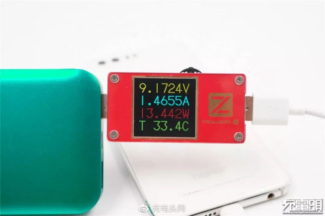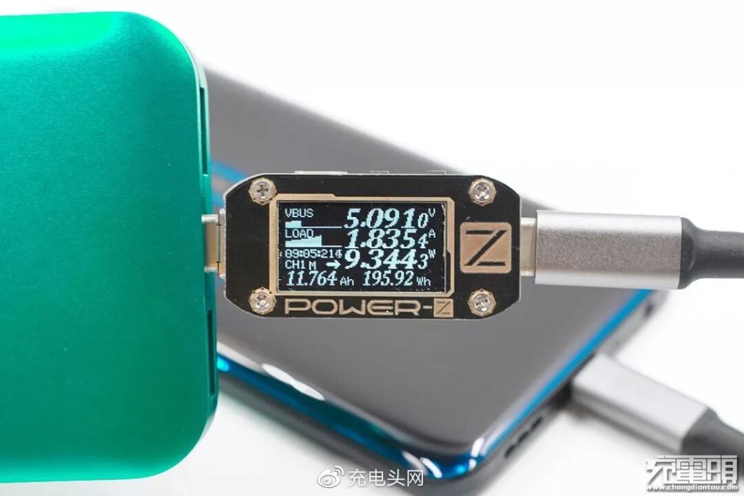 使用小米18W QC充电器给移动电源充电(Micro USB口),电压9.48V,电流2.06A,功率19.56W,开启QC快充。