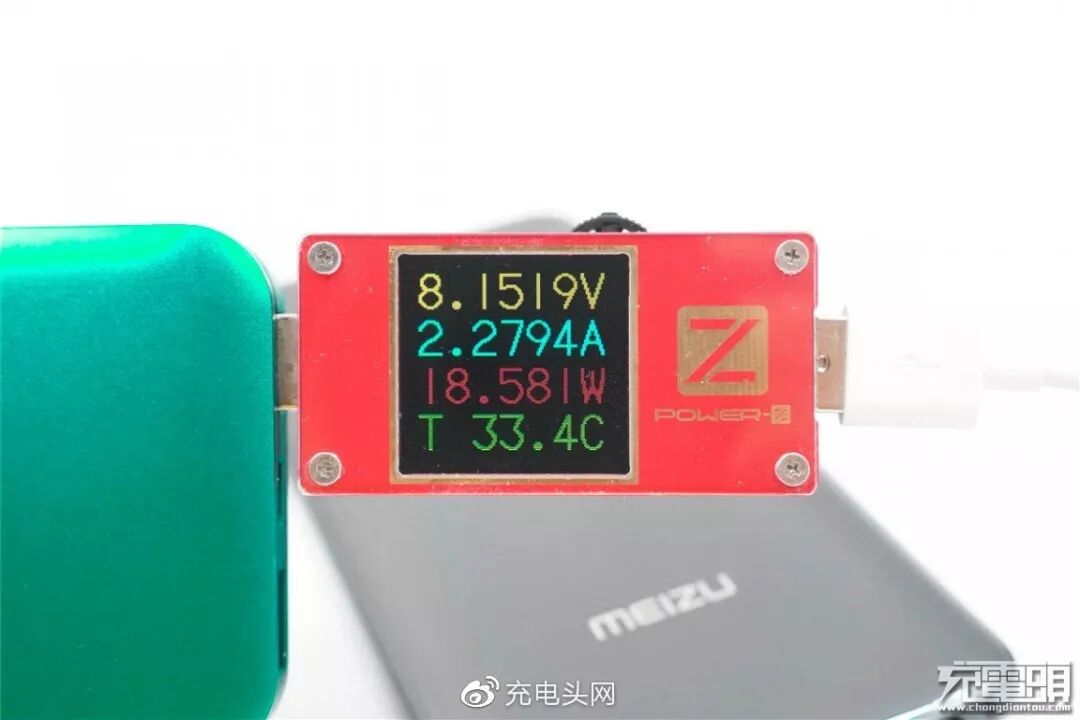 充魅族16th Plus,电压8.15V,电流2.27A,功率18.58W,开启PE快充。