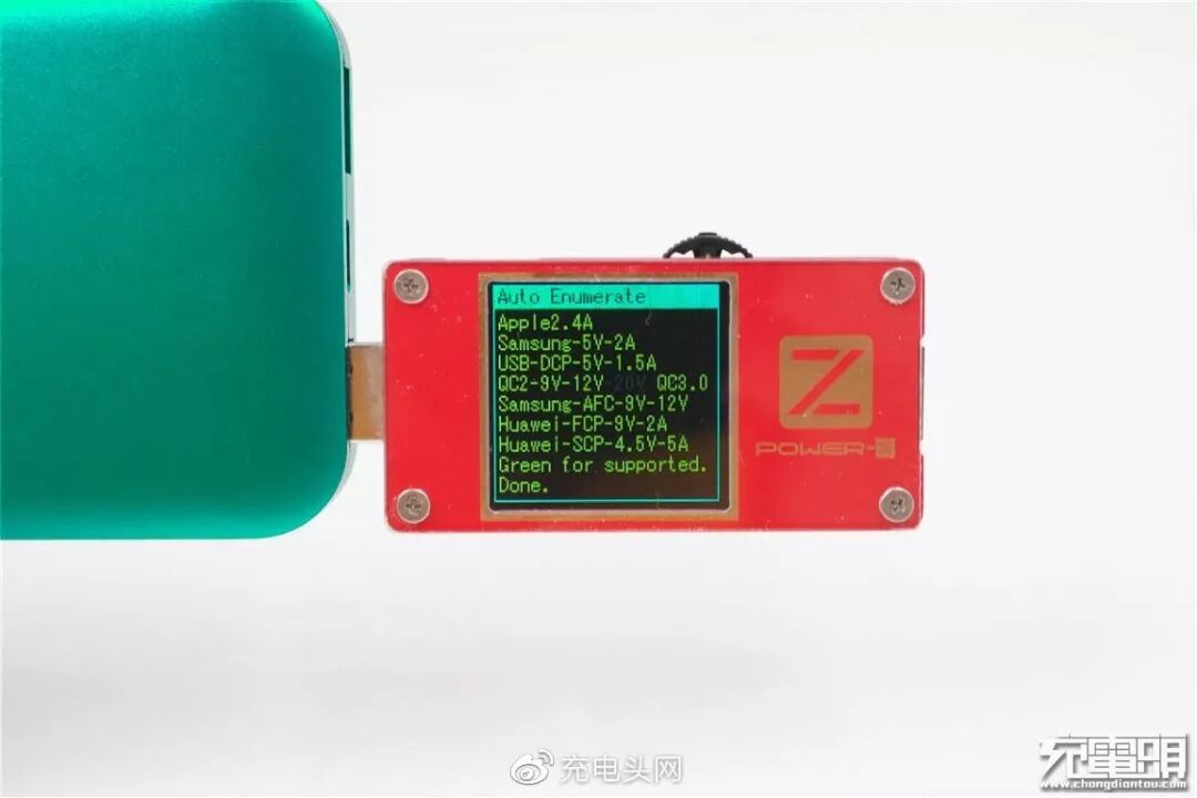 使用ChargerLAB Power-Z KT001测试仪对MOXNICE移动电源USB-A(绿色舌片)进行协议检测,测试表屏幕协议全绿,该输出口支持Apple 2.4A、三星5V/2A、QC 2.0、QC 3.0、AFC、FCP、SCP、等快充协议。