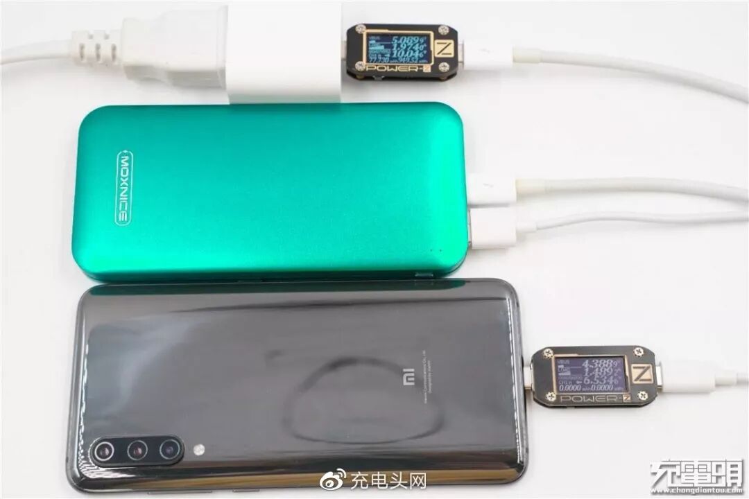 MOXNICE18W PD移动电源支持三口同时输出,输出电压会强制锁定到5V。同时给魅族16th Plus、三星S10+、小米9充电,功率分别为8.51W、0.97W、5.50W。多口输出时电压策略支持的范围够大,3台设备互相自适应充电功率,移动电源正常输出没发生打嗝情况。