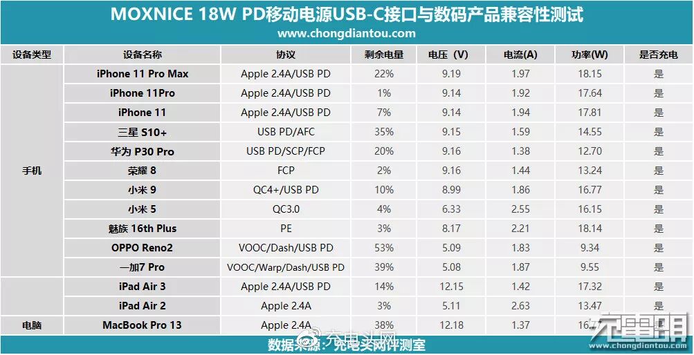 二、MOXNICE 10000mAh 18W PD移动电源性能测试