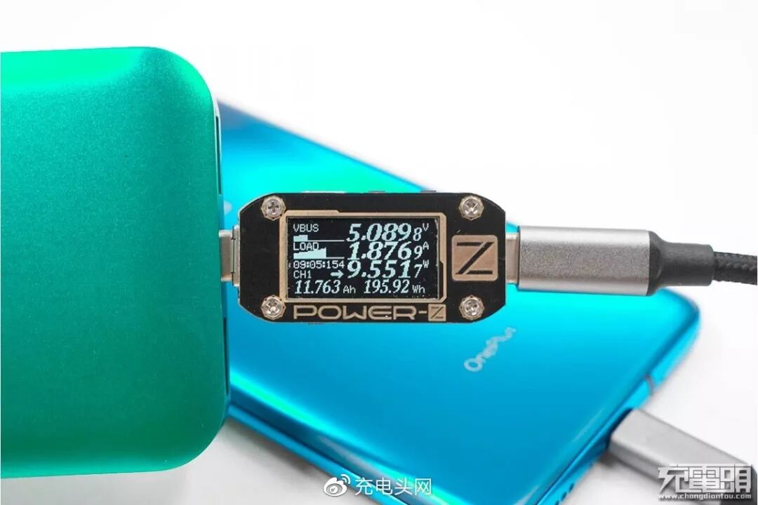 充一加7 Pro,电压5.08V,电流1.87A,功率9.55W正常充电。