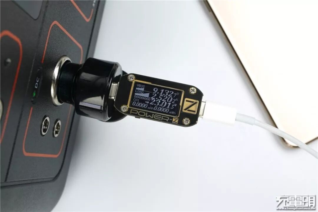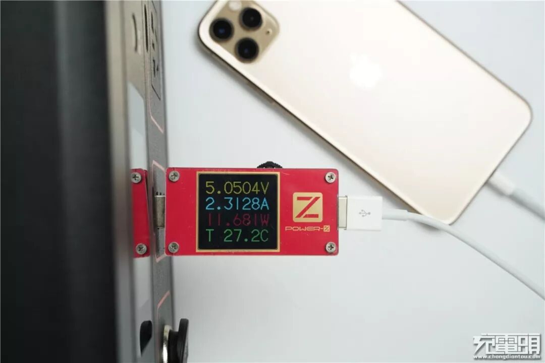 例如用带PD车充给iPhone 11 Pro Max充电,电压9.13V,电流2.52A,功率可达23.01W,开启PD快充。