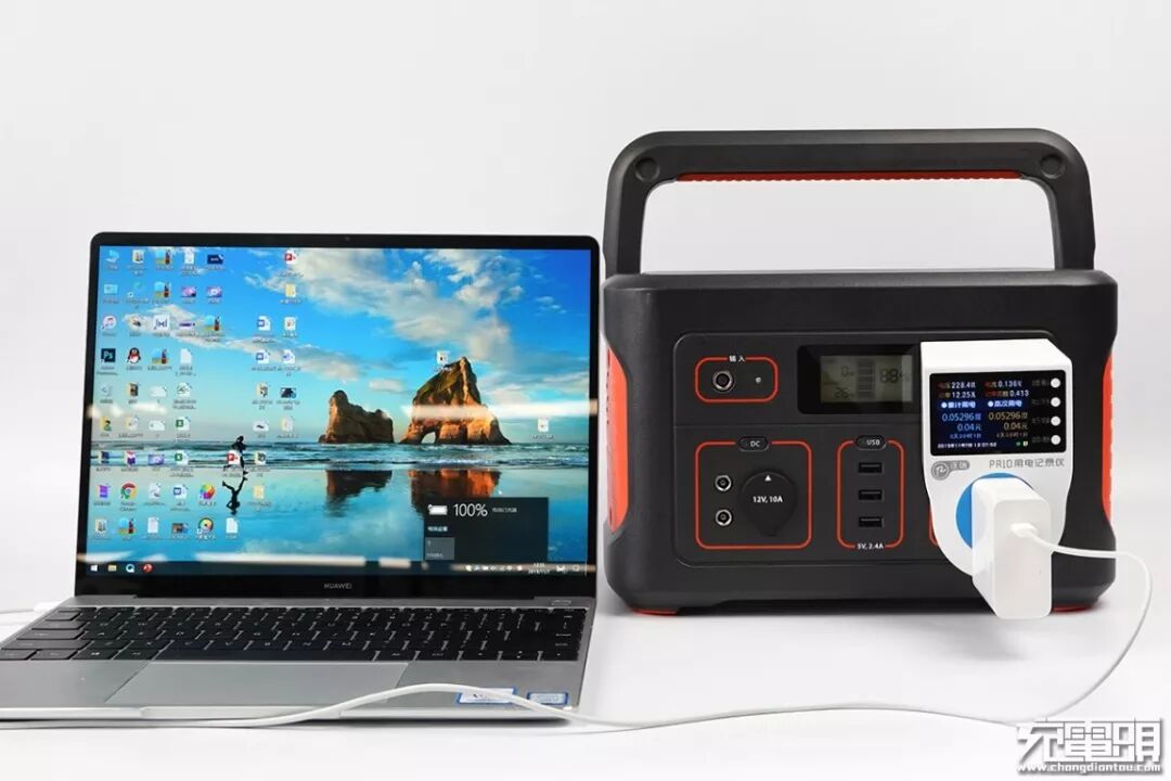 小编拿电小二户外电源600S开启AC输出模式给华为MateBook 13笔记本电脑充电,利用万用功率计纪录电小二户外电源600S输出能量,看看它能给华为MateBook 13充几回电,当前电小二户外电源600S为100%电量。