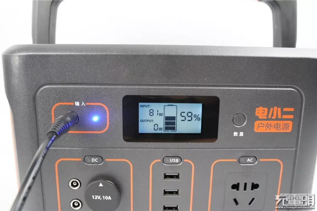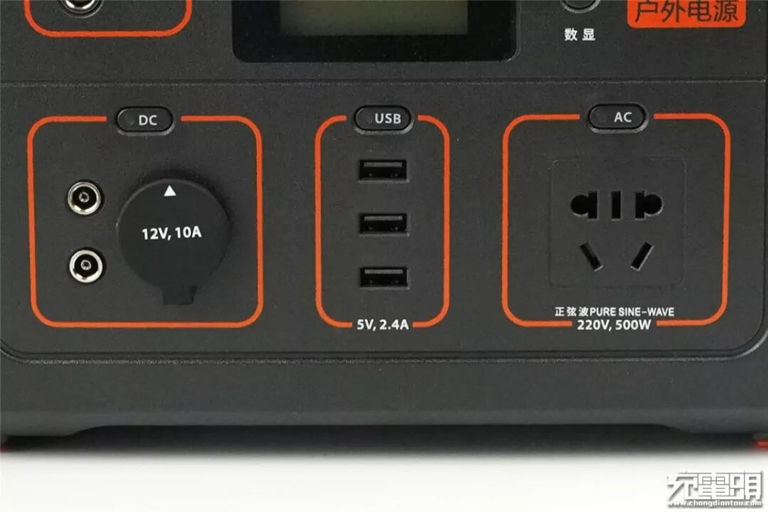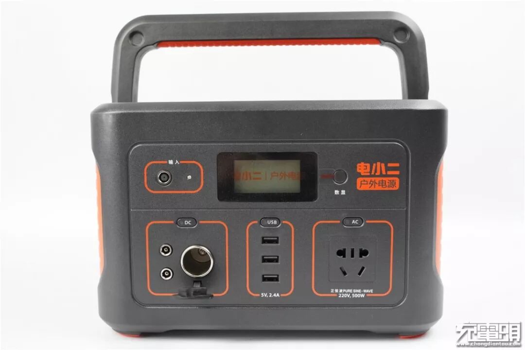 电小二户外电源600S正面布局与电小二500一脉相承,配备了12V/10A车充接口、3个5V/2.4A USB输出接口、500W正弦波交流电输出3种接口。