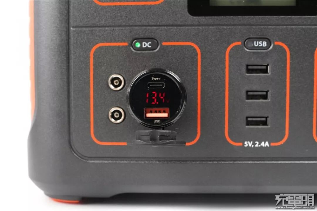 电小二户外电源600S的每个输出部分都由橙色小隔窗分开,并且在底部标识有输出参数。