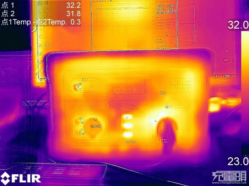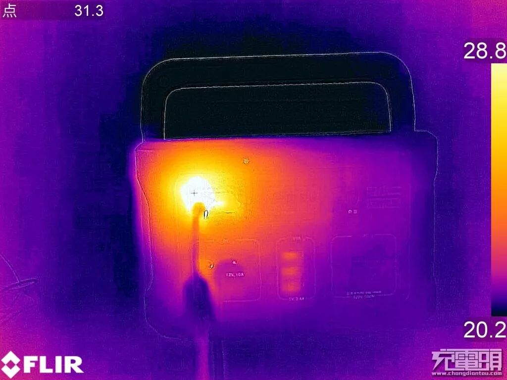 测得户外电源600S温度最高点在圆形充电接口附近,温度为31.3℃,温升大约7℃,手摸上去基本感受不到什么热量。