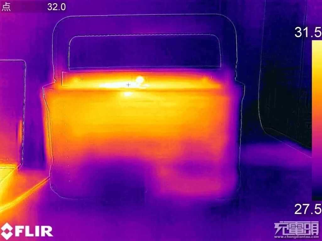 利用FILR ONE PRO热成像测温仪进行温度测试,最高温度出现在背面上方顶部位置,为32℃,手触摸上去基本感受不到什么热量。