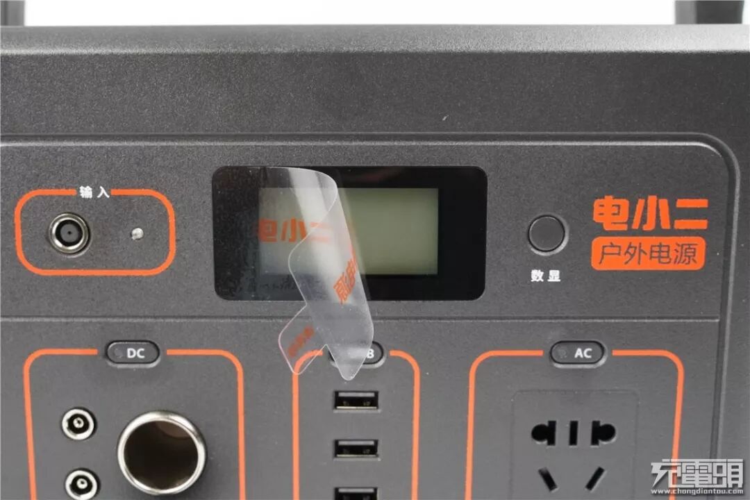 输入模块旁边是电小二户外电源600S的显示屏,为了防止刮花,出厂时显示屏表面会有一层贴膜,在使用的时候需要撕下。