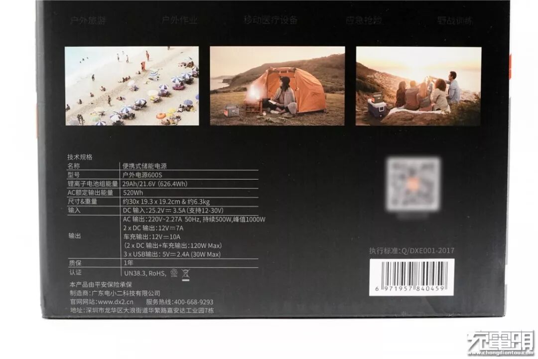 包装的背面与右侧面有户外电源的一些使用场景等。