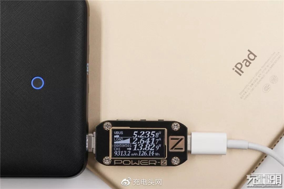 充iPad Air2,电压5.23V,电流2.64A,功率13.82W,开启Apple 2.4A充电模式。