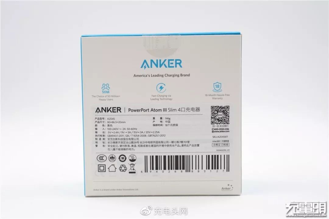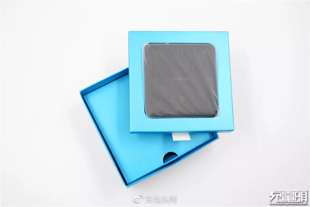 首先来看看产品外包装。充电器外包装延续了ANKER产品一贯的包装设计,白底纸盒,蓝色元素。ANKER从来不在外包装上放产品图吗,只看包装很难想到内部产品到底是个什么样子的,很有神秘感。包装右上角有防伪贴纸,刮开扫码即可辨别真伪。