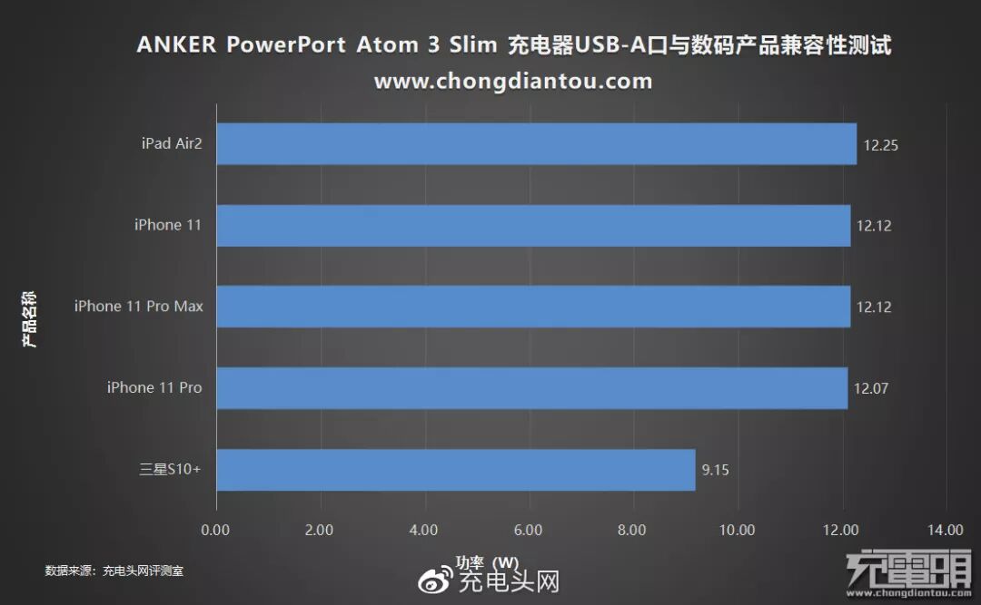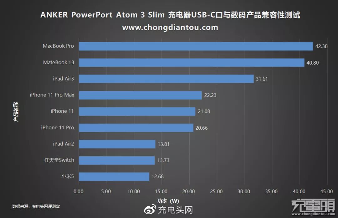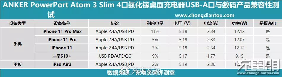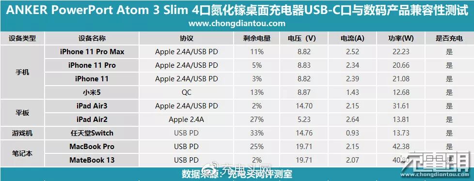 小编还测试了些其他的设备,数据做成了表格,方便大家观看。可以看到ANKER PowerPort Atom 3 Slim 4口氮化镓桌面充电器USB-C口兼容性十分不错,均能与测试设备握手相对应最佳协议充电或者快充。