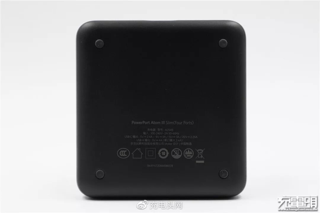 ANKER PowerPort Atom 3 Slim 4口氮化镓桌面充电器底部有着四枚胶垫,防滑性能不错,产品产品铭牌同样印制在该端面,具体为: