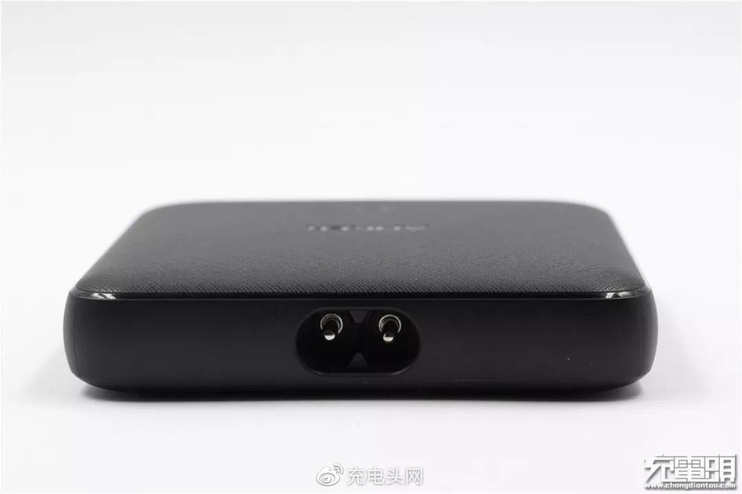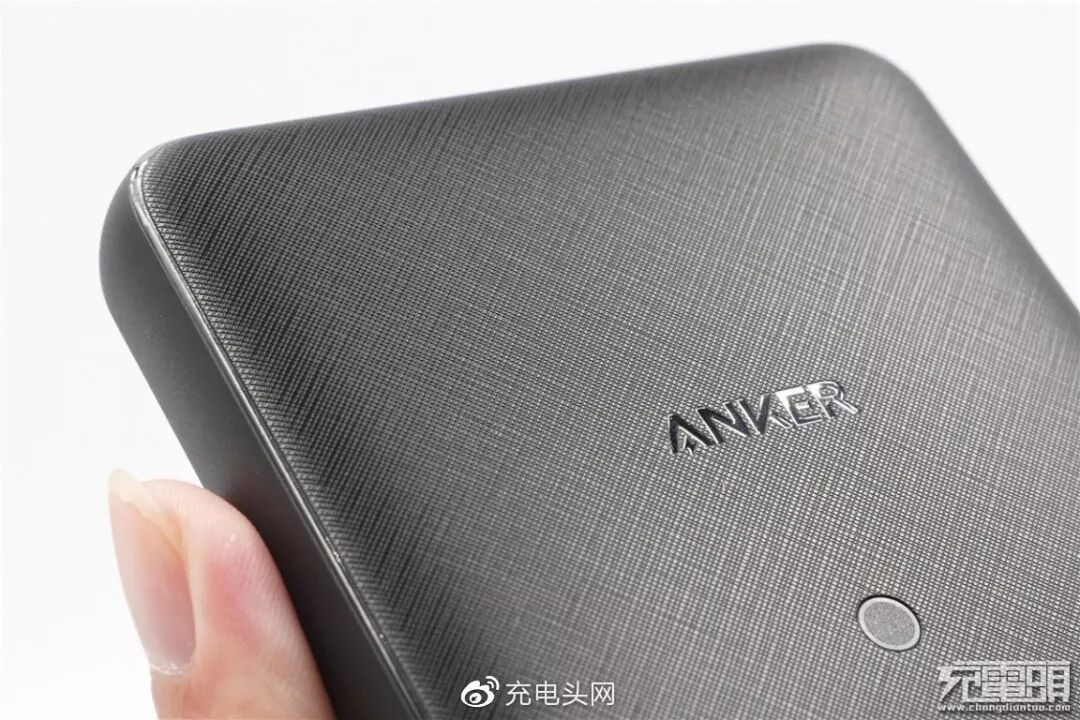 顶面晒纹工艺,带来类磨砂质感;表面四周环绕一圈亮面装饰条,中部凹印“ANKER”字样,与装饰条同为光滑的亮面材质;字样下方圆形部位是充电器的工作状态指示灯。