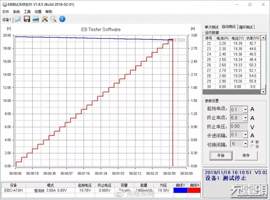 下面小编将对其USB-C口进行步进测试。电压档位设定在20V,电流从0A开始递增,每次递增0.1A,切换间隔为6s。测试结果为:ANKER PowerPort Atom 3 Slim 4口氮化镓桌面充电器USB-C口20V档位最大电流2.9A时会进行关断停止输出,此时功率达到55.90W,高于标称45W。