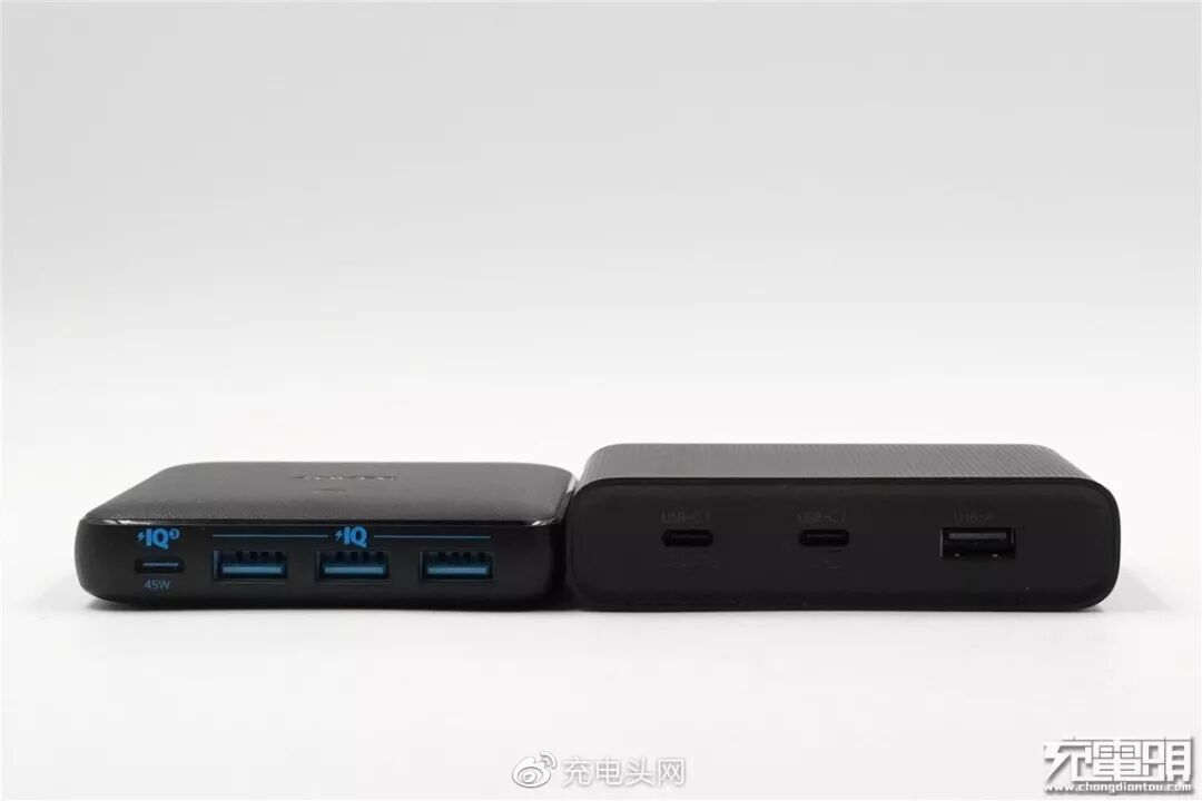 与同为多口桌面充产品的紫米65W 2C1A PD快充充电器厚度对比,更为纤薄。