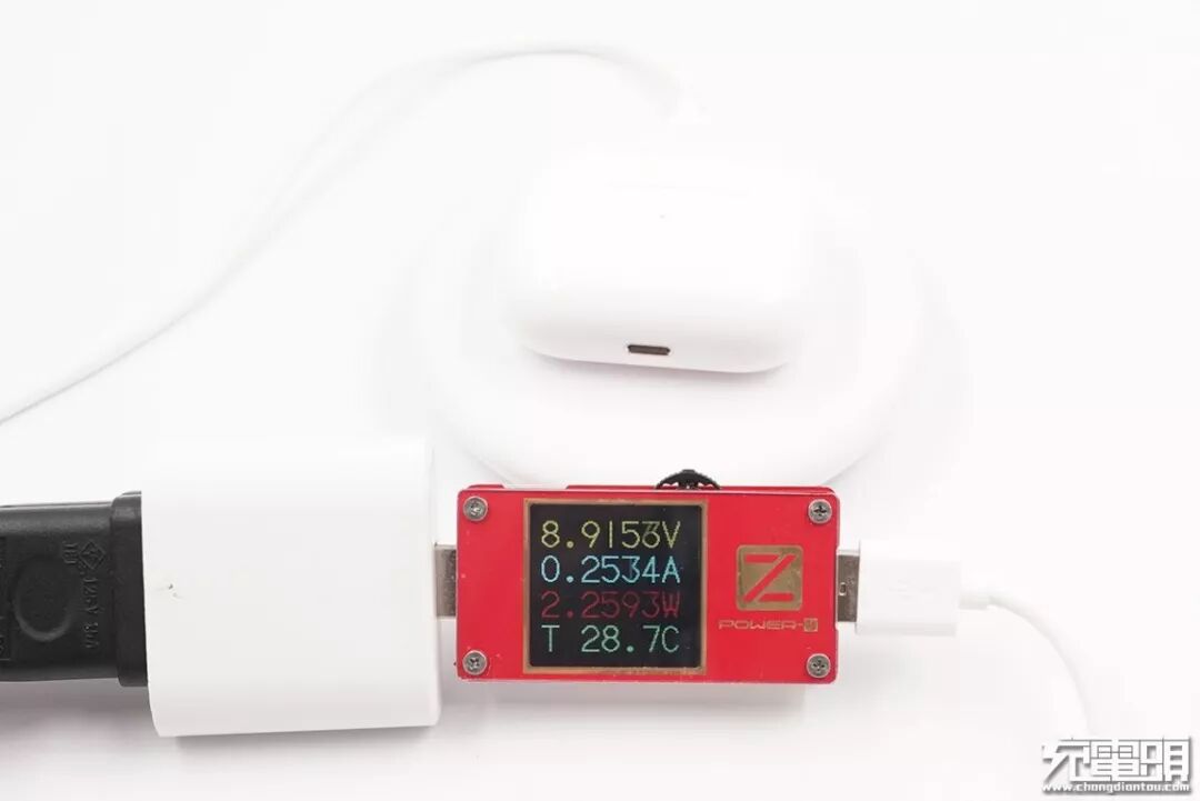 使用小米20W无线充电器给AirPods Pro充电,当前无线充输入端电压为8.91V,电流0.25A,功率2.25W,可以正常充电。