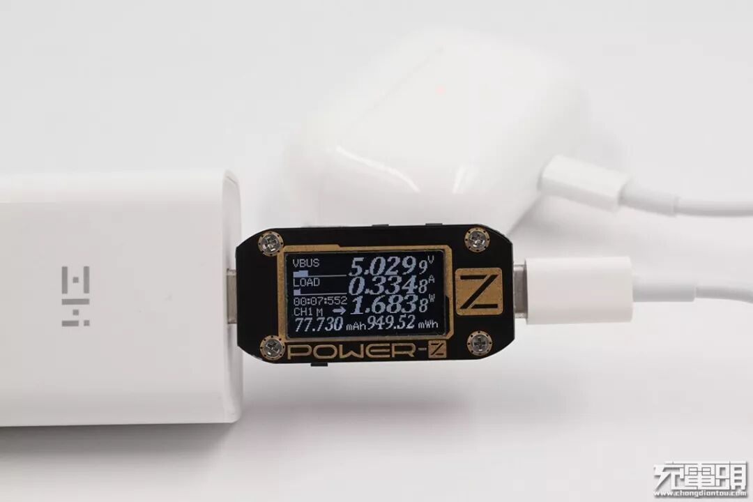 使用紫米18W PD充电器给AirPods Pro充电,这枚充电器快充协议有PD、QC、AFC、FCP,当前电压为5.02V,电流0.33A,功率1.68W,可以正常充电。