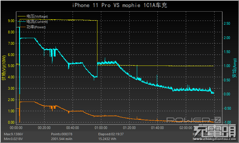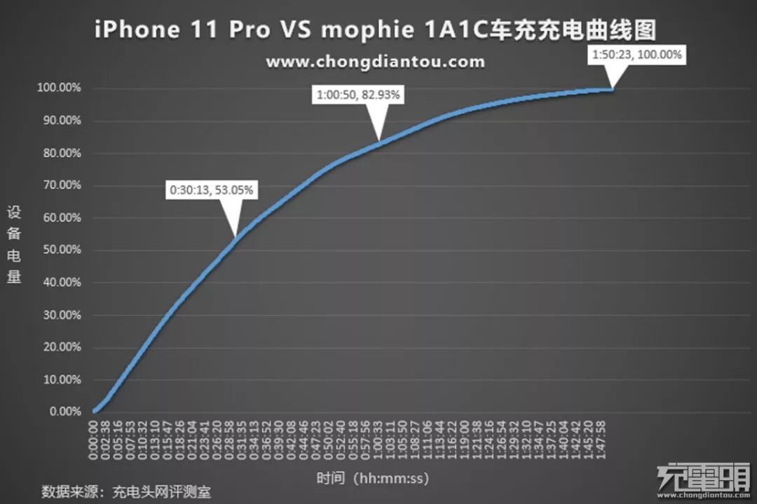 用mophie dual USB car charger车载充电器给iPhone 11 Pro进行0%-100%的充电测试,手机经过了短暂的低电量预充电阶段后,开始握手苹果18W快充,前30分钟充入电量53.05%,1小时充入电量为82.93%,1小时50分钟充电完成,符合苹果30分钟充50%的PD快充标准。