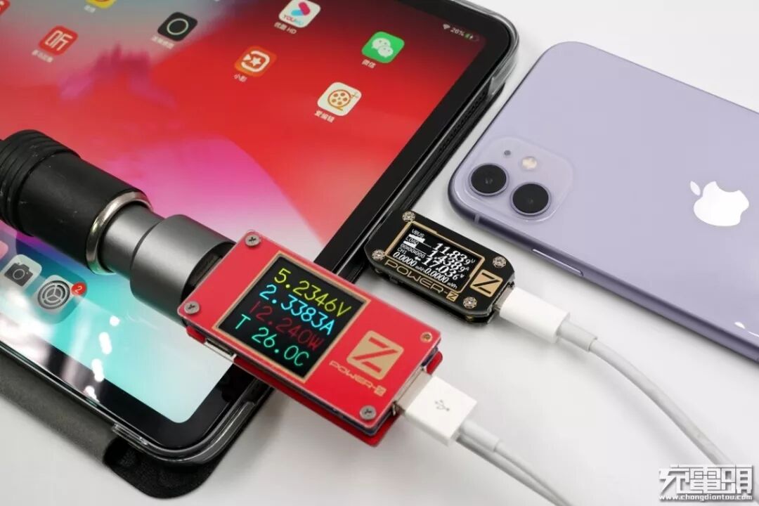用mophie dual USB car charger车载充电器进行双口同时输出测试,车充的USB-A接口对iPhone 11进行充电,电压5.23V,电流2.33A,功率12.24W,握手apple 2.4A协议。车充的USB-C接口对iPad Pro 11进行充电,电压11.83V,电流1.43A,功率17.03W,开启PD快充。