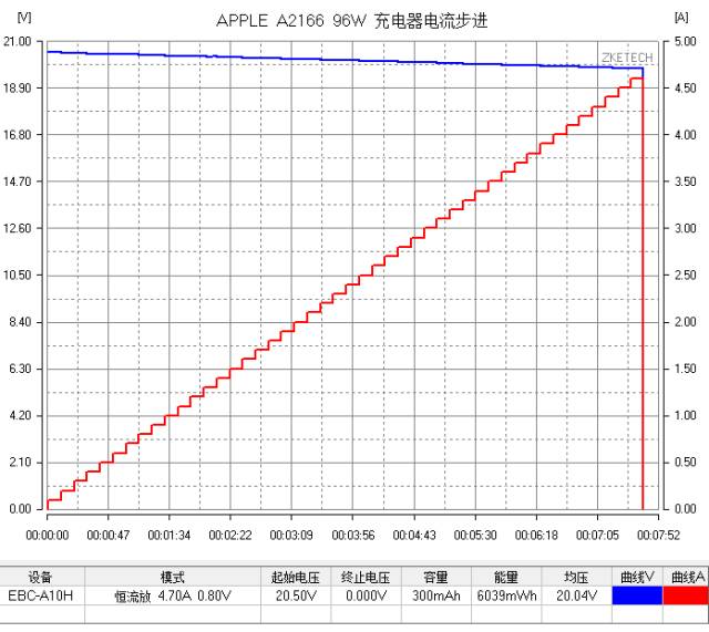 小编使用程控电子负载仪对苹果96W充电器进行电流步进测试,以10秒为时间长度0.1A为电流上涨幅度,一直持续增加输出功率直到充电器保护,测试充电器最大输出功率上限。