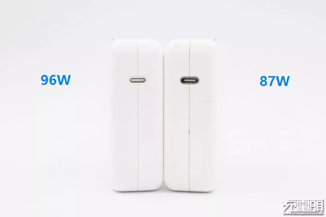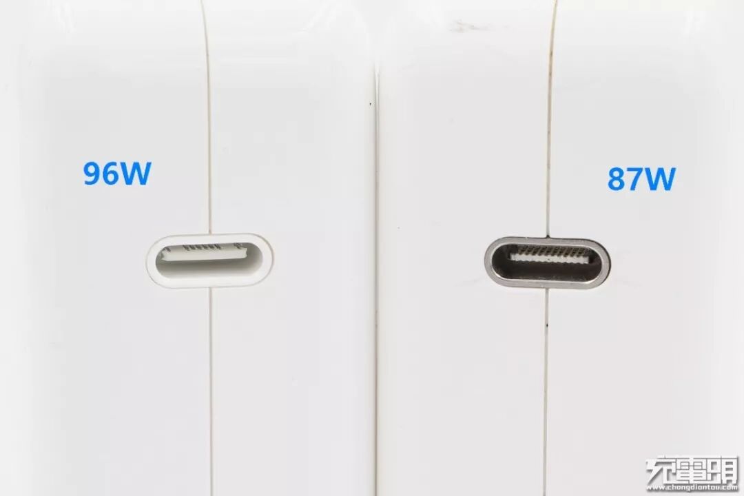 96W充电器的USB-C接口母座颜色全白,看上去像是塑料接口,在充电头网的拆解文章里面可以看到为塑料包裹金属骨架设计;87W充电器的母座材料为金属材质,96W充电器接口非满PIN脚,87W充电器接口为满PIN脚。