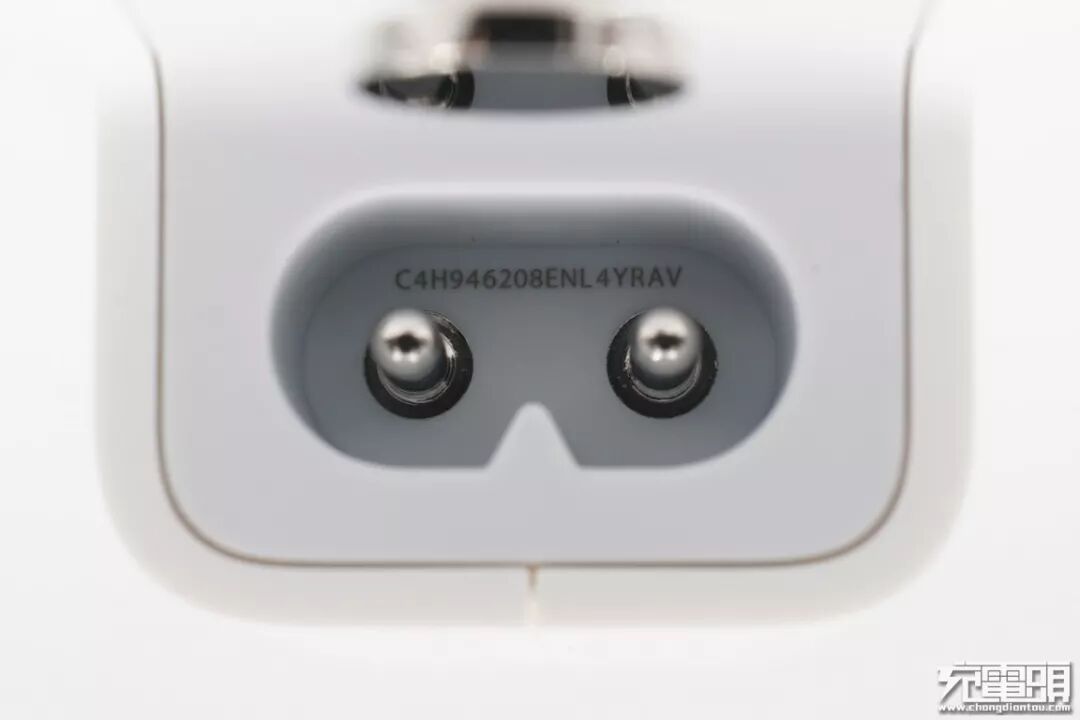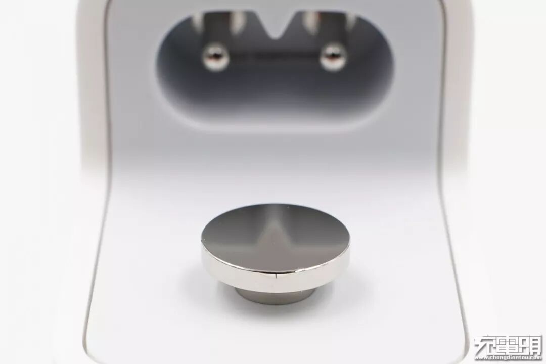 金属固定座特写,表面非常光滑,工艺精美。另外该固定座还是充电器的接地脚,替换成苹果三脚插头后接地功能生效。
