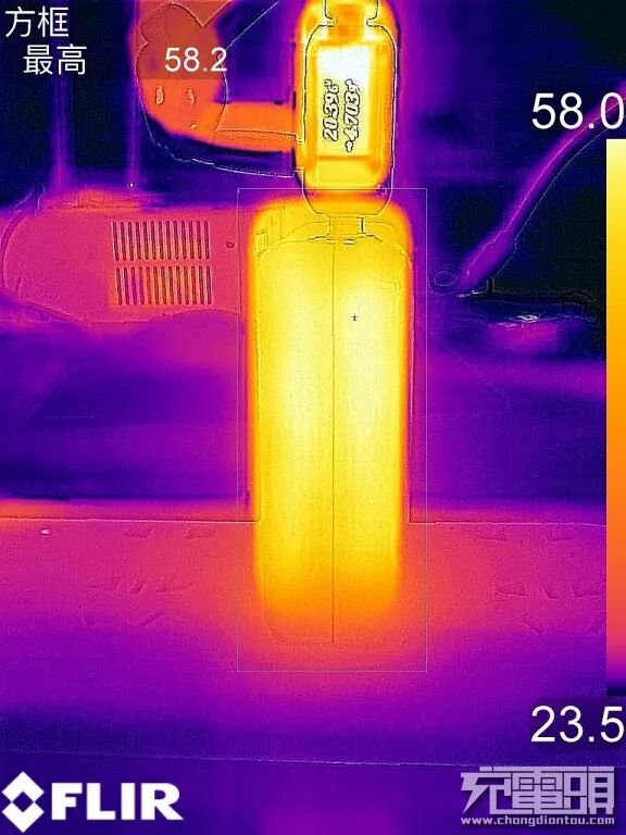 充电器侧面热量最高为58.2度,整体发热均匀。
